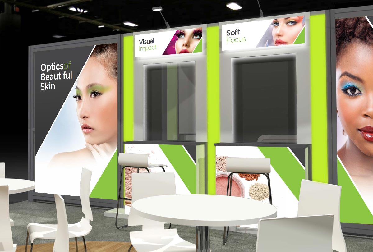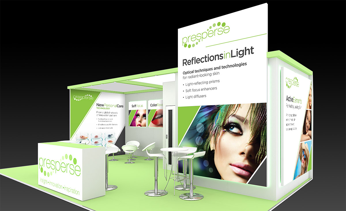 Presperse required a booth design to showcase a range of dynamic effects that come with today’s modern color-cosmetic technologies.